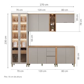 Dimensoes da cozinha montada: Altura: 230 cm Largura: 270 cm Profundidade: 52 cm Garantia: 03 meses