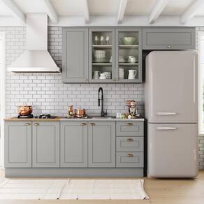 A Cozinha Modulada Americana 4 Peças da Móveis Henn é perfeita para quem busca elegância e praticidade no ambiente. Produzida em MDF com pintura UV, conta com frentes com usinagem em baixo relevo, portas com dobradiças metálicas com amortecimento e puxadores em zamac ouro velho sendo pontuais nas portas superiores e concha nas inferiores. O aéreo de 120cm possui 2 portas com vidro incolor, trazendo leveza ao visual. O balcão de 120cm acompanha divisor de talheres (sem tampo e cuba), enquanto o balcão de 80cm vem com tampo em MDP para cooktop. Pés com regulagem e excelente espaço interno completam esse conjunto sofisticado.
