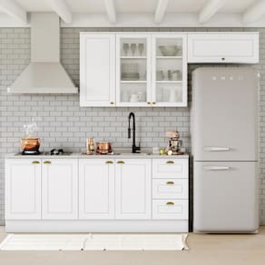 A Cozinha Modulada Americana 4 Peças da Móveis Henn é perfeita para quem busca elegância e praticidade no ambiente. Produzida em MDF com pintura UV, conta com frentes com usinagem em baixo relevo, portas com dobradiças metálicas com amortecimento e puxadores em zamac ouro velho sendo pontuais nas portas superiores e concha nas inferiores. O aéreo de 120cm possui 2 portas com vidro incolor, trazendo leveza ao visual. O balcão de 120cm acompanha divisor de talheres (sem tampo e cuba), enquanto o balcão de 80cm vem com tampo em MDP para cooktop. Pés com regulagem e excelente espaço interno completam esse conjunto sofisticado.