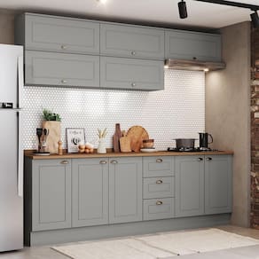 A Cozinha Modulada Americana 8 Peças da Móveis Henn combina beleza clássica e funcionalidade moderna. Produzida em MDF com pintura UV, traz portas com dobradiças metálicas com amortecimento, pistão a gás nos aéreos de 80cm e frentes com usinagem em baixo relevo. Os puxadores em zamac ouro velho pontuais nas portas superiores e concha nas inferiores valorizam o acabamento retrô sofisticado. Os balcões de 120cm e 40cm acompanham tampos em MDP, além de tampo especial para cooktop no balcão de 80cm. O balcão de 120cm também possui divisor de talheres. Com pés com regulagem de altura e excelente espaço interno, é a escolha ideal para cozinhas elegantes e bem planejadas.