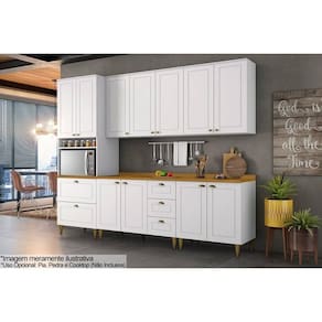 Cozinha Completa Americana c/ Pés 7 Peças (2Aéreos+2Balcões+1Paneleiro+2Complementos) C5P60 Branco - Henn Abaixo segue os produtos que compoem o KIT: - Tampo p/ Balcão Cozinha 80x53cm Nature - Henn - 1 unidades Dimensões: Alt: 3cm x Larg80cm x Comp/Profund:80cm