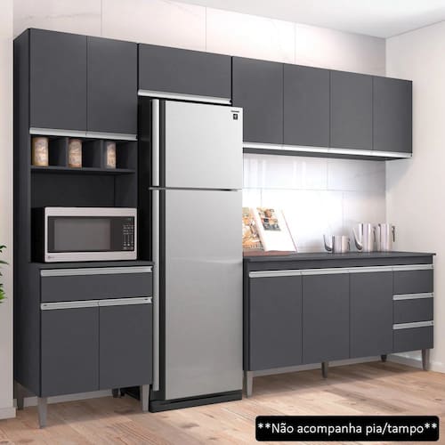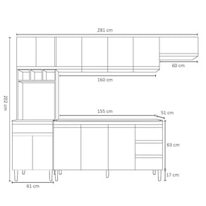 Material da Porta: MDP. Quantidade de Portas: 12 Portas. Tipo de dobradiças: Metálicas. Tipo de Porta: Convencional/Basculante. Possui Gavetas: Sim. Material da Gaveta: MDP. Quantidade de Gavetas: 4 Gavetas. Tipo de corrediças: Metálicas. Tipo de Pés: Plástico com regulagem. Dimensões do Produto: Largura: 280 cm. Altura: 201 cm. Profundidade: 51 cm. Peso: 116 Kg. Outras medidas: (L x A x P) Balcão Gabinete: 155 x 80 x 51 cm. Armário Aéreo 160cm: 160 x 55 x 32 cm. Armário Aéreo 60cm: 60 x 30 x 27 cm. Paneleiro: 61 x 202,5 x 51 cm. **NÃO ACOMPANHA PIA/TAMPO. Montagem: Recomendamos que seja feita por um profissional. Recomendação de Limpeza: Utilize pano levemente úmido. ATENÇÃO, OBSERVAÇÕES IMPORTANTES. As imagens são meramente ilustrativas, não serão enviados objetos de decoração, eletrônicos e demais itens que não estejam especificados nos itens inclusos. É indispensável que seja feita a conferência do produto no ato da entrega e caso haja alguma divergência, seja feito o contato imediato com a loja e notificação no canhoto. Constatando defeito no ato da entrega o produto não deverá ser montado até tratativa com a loja. Não será efetuada a troca do produto após a montagem ter sido efetuada. A montagem é de total responsabilidade do cliente e defeitos na montagem serão tratadas como assistências. Os processos de pendências serão tratados mediante a fotos para analise e conferência da informação. As cores do produto podem variar de acordo com o seu monitor, a iluminação do ambiente em que você está e até mesmo a sua percepção visual. Não nos responsabilizamos, no ato da entrega, por subir escadas e elevadores. Eventuais despesas são de responsabilidade do cliente. Dúvidas serão tratadas via protocolo.