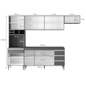 A Cozinha Modulada 5 Peças é a escolha ideal para quem busca conferir modernidade e sofisticação ao ambiente. Sua estrutura é composta por MDP, apresentando um acabamento com pintura UV. Este conjunto conta com 12 portas articuladas equipadas com dobradiças metálicas, incluindo uma basculante com pistão a gás. Dispõe de espaço para micro-ondas ou outros aparelhos domésticos, 3 nichos garrafeiros, 4 gavetas com corrediças telescópicas de deslize suave, balcão com tampo resistente em MDP, prateleiras internas para a organização de utensílios, puxadores em alumínio e acompanham pés em PVC com regulagem.