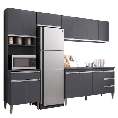 A Cozinha Modulada 5 Peças é a escolha ideal para quem busca conferir modernidade e sofisticação ao ambiente. Sua estrutura é composta por MDP, apresentando um acabamento com pintura UV. Este conjunto conta com 12 portas articuladas equipadas com dobradiças metálicas, incluindo uma basculante com pistão a gás. Dispõe de espaço para micro-ondas ou outros aparelhos domésticos, 3 nichos garrafeiros, 4 gavetas com corrediças telescópicas de deslize suave, balcão com tampo resistente em MDP, prateleiras internas para a organização de utensílios, puxadores em alumínio e acompanham pés em PVC com regulagem.