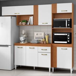 A Cozinha Modulada Vitória combina praticidade e design inteligente para otimizar seu espaço. Composta por 2 peças produzidas em MDP 12 e 15 mm (fundo 3 mm) com acabamento em Verniz Texturizado. Conta com portas equipadas com dobradiças metálicas (sendo uma basculante com amortecedor a gás), gaveta com corrediças metálicas, puxadores plásticos, pés plásticos e tampo em MDP 15 mm. Possui ainda nicho decorativo funcional e espaço ideal para micro-ondas e/ou forno de até (A.44,2 cm X L.58 cm X P.37,8 cm). O sistema de montagem flex permite a instalação do módulo para o lado direito ou esquerdo, conforme a necessidade do ambiente. Destaque para o detalhe ripado em alto relevo (MDP 15 mm). Este produto será entregue em 03 volumes.