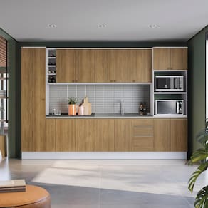 A perfeita união entre estilo e qualidade você encontra no Combo CB1081 da Cozinha Celeste da Kappesberg. Produzida em chapa MDF de 15mm, ela garante robustez, firmesa e qualidade, além de um acabamento perfeito. E com sete camadas de pintura, tanto na parte interna quanto na externa, a caixaria conta com acabamento em brilho na cor branca, enquanto que as frentes, com pintura touch na cor nogueira, possui a textura dos veios da madeira, uma combinação aconchegante e linda, deixando sua cozinha perfeita. Com oito módulos mais tampos, o conjunto possui 2,30m de altura e 3,40m de largura, combinando estilo e qualidade para todos os ambientes. E com amplo espaço interno, você poderá organizar louças e mantimentos, além de preparar receitas especiais e deliciosas para receber sua família ou amigos. E para um melhor acabamento, a cozinha possui rodapés, mas também acompanha as ferragens para ser montada suspensa, do jeito que você preferir. Os diferenciais ficam por conta das dobradiças com amortecimento, garantindo um fechamento suave e sem ruídos, das corrediças telescópicas e os puxadores na cor dourada, complementando o estilo e qualidade do produto. Viva momentos especiais e renove seu espaço com a Cozinha Celeste da Kappesberg.