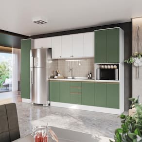 Acabamento: Pintura Brilho / Pintura Fosco | Cor: Branco/Verde Oliva | Corrediças: Telescópicas | Dobradiça: Com Amortecimento / Sem Amortecimento | Garantia: 3 meses para defeito de fabricação | Matéria-prima: MDF / MDP BP | Peso suportado por cada gaveta: 6 Kg | Peso suportado por cada prateleira: 7 kg | Puxadores: Alumínio / Metálicos / Puxadores de Metal e de Alumínio | Quantidade de gavetas: 3 | Quantidade de portas: 1 / 3 | Quantidade de prateleiras: 1 / 2 / 4 / 5 | Sistema de montagem: Parafuso Philips | Tipo de porta: Bater | Tipo de móveis de cozinha: Cozinha completa