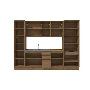 Acabamento: Pintura Touch | Acabamento da Fita Borda: Papel | Cor: Nogueira | Corrediças: Telescópicas | Dobradiça: Com Amortecimento | Garantia: 3 meses para defeito de fabricação | Matéria-prima: MDF / MDF/ Vidro / MDP | Peso suportado por cada gaveta: 6 Kg | Peso suportado por cada prateleira: 7 kg | Puxadores: Alumínio / Metálicos / Puxadores de Metal e de Alumínio | Quantidade de gavetas: 1 / 3 | Quantidade de portas: 1 / 2 / 3 | Quantidade de prateleiras: 1 / 2 / 5 | Sistema de montagem: Parafuso Philips | Tipo de porta: Bater