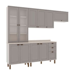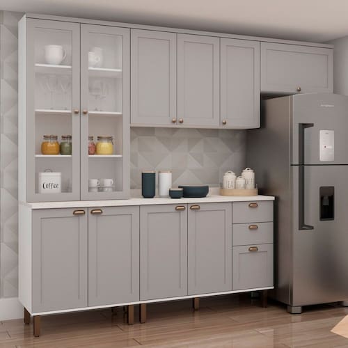 Renove seu espaço com a Cozinha Iluminata e aproveite a combinação perfeita de funcionalidade e design de alto padrão. Acabamento da Prateleira: Pintura Texturizada UV Escala de Brilho da Prateleira: Fosco Acabamento da Gaveta: Pintura Escala de Brilho da Gaveta: Fosco Material do Puxador da Gaveta: ABS Acabamento da Porta: Pintura UV Escala de Brilho da Porta: Fosco Material do Puxador da Porta: PVC Acabamento dos Pés: Pintura Acompanha Tampo: Sim Altura dos Pés: 17 cm Ambiente Principal: Cozinha Complexidade da Montagem: Média: pode ser montado por mais de uma pessoa e/ou necessite de maior conhecimento para montagem Cor: Branco/Cinza Cor do Produto: Branco/Cinza Cor Flex: Não Cor Interna: Branco Escala de Brilho: Fosco Espessura do Material da Estrutura: 15 mm Espessura do Tampo: 25 mm Gaveta com Chave: Não Informações Complementares: Cozinha Completa com Cristaleira Forno 100% MDF Iluminata Itens Inclusos: Cozinha Completa com Cristaleira Forno, Kit Ferragens, Manula de Montagem Linha ou Coleção: Iluminata Manual de Montagem e Instalação: https://product-hub-prd.madeiramadeira.com.br/910816/documents/c7ebf7d6-e867-4316-ba57-c7d172c5543d7fe6c870ade631488275cm0018.pdf Material da Dobradiça/Corrediça da Porta: Metálica Material da Gaveta: MDF Material da Porta: MDF Material da Prateleira: MDF Material do Tampo: MDF Material dos Pés: Plástico Medida de cada item (A x L x P): Cristaleira (2,30x80x52,5)Aéreo de 1,20 (78x1,20x31,5)Balcão de 1,20 (91x,20x51)Aéreo basculante( 46,5x80x31,5) modular: Sim Montagem Flex: Não Necessita Montagem: Sim O Balcão Acompanha Pia: Não Origem do Produto: Nacional Pés Reguláveis: Sim Peso: 123,8 kg Peso Máximo por Gaveta: 5 kg Peso Máximo por Prateleira: 5 kg Possui Pés: 09 Possui Portas: Sim Possui Prateleiras: Sim Possui recorte para Cooktop: Não Possui Rodízio: Não Possui Vidro: Sim Recomendações de Uso, Manutenção e Limpeza: Para retirada do número de identificação da peça, usar pano levemente umidecido com alcool, para limpeza em geral pano seco Sapatas Niveladoras: Não Sistema de Montagem: Parafusos e Cavilhas e minifix Suporta Até (kg): 70 kg Tamanho Indicado da Pia: 120cm Tamanho Indicado do Tampo ou Pia: 120 Tipo de Corrediça da Gaveta: Metálica Telescópica Tipo de Dobradiça da Porta: Soft close Tipo de Puxador da Gaveta: Externo Tipo de Puxador da Porta: Externo