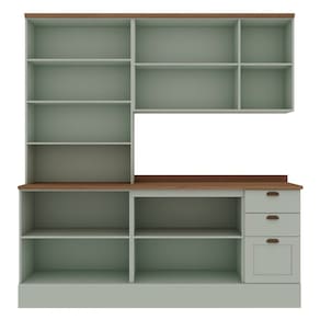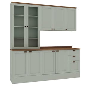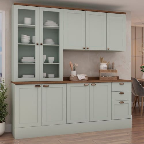 Transforme sua cozinha com a Iluminata, que combina beleza, praticidade e funcionalidade em um só produto! Acabamento da Prateleira: Pintura UV Escala de Brilho da Prateleira: Fosco Acabamento da Gaveta: Pintura UV Escala de Brilho da Gaveta: Fosco Material do Puxador da Gaveta: ABS Acabamento da Porta: Pintura UV Escala de Brilho da Porta: Fosco Material do Puxador da Porta: ABS Acabamento dos Pés: Pintura Acompanha Tampo: Sim Altura dos Pés: 17 cm Ambiente Principal: Cozinha Complexidade da Montagem: Média: pode ser montado por mais de uma pessoa e/ou necessite de maior conhecimento para montagem Cor: Mint/Ébano Cor do Produto: Mint/Ébano Cor Flex: Não Cor Interna: Mint Escala de Brilho: Fosco Espessura do Material da Estrutura: 15 mm Espessura do Tampo: 25 mm Gaveta com Chave: Não Informações Complementares: Cozinha Modulada Compacta 4 Peças com Armário Aéreo 2 Portas Vidro 100% MDF com Tampo Itens Inclusos: Cozinha Modulada Compacta 4 Peças com Armário Aéreo 2 Portas Vidro 100% MDF com Tampo e manual de montagem Linha ou Coleção: Iluminata Manual de Montagem e Instalação: https://product-hub-prd.madeiramadeira.com.br/910983/documents/48adfd65-1803-44b6-ac63-f417a8560139198893473417169230639944.pdf Material da Dobradiça/Corrediça da Porta: Metálica Material da Gaveta: MDF Material da Porta: MDF Material da Prateleira: MDF Material dos Pés: ABS modular: Sim Montagem Flex: Sim Necessita Montagem: Sim O Balcão Acompanha Pia: Não Origem do Produto: Nacional Pés Reguláveis: Sim Peso: 135,55 kg Peso Máximo por Gaveta: 5 kg Peso Máximo por Prateleira: 5 kg Possui Espelho: Não Possui Possui Pés: 09 Possui Portas: Sim Possui Prateleiras: Sim Possui Rodízio: Não Possui Vidro: Sim Recomendações de Uso, Manutenção e Limpeza: Para retirada do número de identificação da peça, usar pano levemente umidecido com alcool, para limpeza em geral pano seco Sapatas Niveladoras: Sim Sistema de Montagem: Parafusos e Cavilhas e minifix Suporta Até (kg): 50 kg Tamanho Indicado da Pia: 1.2 Tipo de Corrediça da Gaveta: Telescópica Tipo de Dobradiça/Corrediça da Porta: Soft close Tipo de Puxador da Gaveta: Externo Tipo de Puxador da Porta: Externo