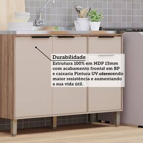 Características: Estrutura: MDP 15mm Acabamento da Caixaria/Corpo: Pintura UV Touch Acabamento das Portas/Frontal: BP Quantidade e Tipo de Portas: 3 de Bater e 3 Basculantes Tipo de Dobradiças: Metálicas Quantidade de Gavetas: 3 Tipo de Corrediças: Metálicas Telescópicas Tipo de Puxadores: Alça em Alumínio Preto Tampo: MDP 25mm Quantidade de Prateleiras: 3 Tipo de Pés: Plástico *PS com regulagem de altura - *Poliestireno Garantia: 3 meses Sistema de Montagem: Cavilhas e Parafusos