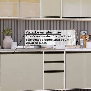 A Cozinha Linea foi desenvolvido aliando beleza e praticidade ao seu ambiente. As portas embutidas remetem ao planejado, ainda conta com acessorios requintados como dobradicas em 35mm com amortecimento Slowmotion, dobradica com amortecedor incorporado para fechamento suave de portas, puxadores tipo gola em perfil aluminio na cor Inox e pes em PS -poliestireno- na cor champagne. Possui gavetas com corredicas metalicas telescopicas em tres estagios, para abertura total. Perfeito para sua cozinha.