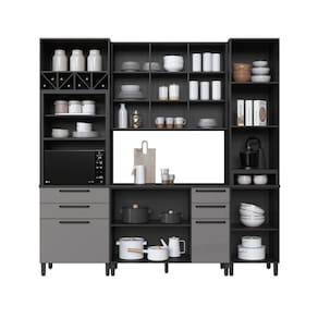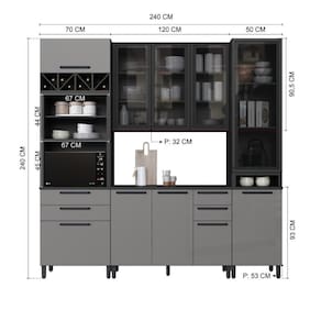 Materiais do corpo: MDP | Altura (cm): 240 | Largura (cm): 240 | Quantidade de portas: 10 | Conteúdo da embalagem: Torre Quente 70cm, Aéreo 120cm, Paneleiro Simples 50cm, Balcão 120cm e Manual de Montagem. | Profundidade (cm): 53 | Tipo de móveis de cozinha: Cozinha Compacta | Inclui manual de montagem: Sim | Requer montagem: Sim | Marca: Fidelitá Móveis | Estilo: Moderno | Condição do item: Novo | Modelo: Mônaco | Cor: Chumbo/Titânio
