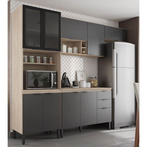CaracterísticasEstrutura em MDP.Pintura em acabamento UV.10 Portas sendo 2 com vidros com dobradiças metálicas02 Gavetas com corrediças metálicas Espaço para forno ou Micro-ondasPrateleiras com amplo espaço.Nicho porta Vinhos *Acompanha Tampo OBJETOS DECORATIVOS NÃO ACOMPANHAM OS PRODUTOSLimpar o produto utilizando apenas pano umedecido com água, nunca utilizar produtos abrasivos ou esponjas de aço.Acompanha manual e todos os acessórios para montagem.Recomendamos que a montagem seja feita por um profissional qualificado.Garantia de 03 meses para eventuais defeitos de fabricação.DimensõesAltura: 219 cmLargura: 260 cmProfundidade 52 cmItens Inclusos01 Armário Aéreo (94101).01 Armário Aéreo (94221).01 Paneleiro (94551).01 Balcão 120 cm (93231).01 Tampo c/Vista 120 cm (92000).Peso Total: 160 Kg 06 volumes.ATENÇÃO OBSERVAÇÕES IMPORTANTESAs imagens são meramente ilustrativas, não serão enviados objetos de decoração, eletrônicos e demais itens que não estejam especificados nos itens inclusos. É INDISPENSÁVEL que seja feita a conferência do produto no ato da entrega e caso haja alguma divergência, seja feito o contato imediato com a loja e notificação no canhoto. CONSTATANDO DEFEITO NO ATO DA ENTREGA O PRODUTO NÃO DEVERÁ SER MONTADO ATÉ TRATATIVA COM A LOJA. NÃO SERÁ EFETUADA A TROCA DO PRODUTO APÓS A MONTAGEM TER SIDO EFETUADA. A montagem é de total responsabilidade do cliente e defeito na montagem serão tratadas como assistências. OS PROCESSOS DE PENDÊNCIAS SERÃO TRATADOS MEDIANTE A FOTOS PARA ANALISE E CONFERÊNCIA DA INFORMAÇÃO. As cores do produto podem variar de acordo com o seu monitor, a iluminação do ambiente em que você está e até mesmo a sua percepção visual. Não nos responsabilizamos, no ato da entrega, por subir escadas e elevadores. Eventuais despesas são de responsabilidade do cliente. Dúvidas serão tratadas via protocolo.