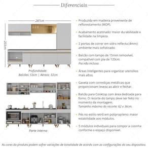 Versatilidade: O balcão com tampo (15mm) recortável é compatível com Cooktop de 4 ou 5 bocas e possui nicho para acomodar o seu forno, otimizando o espaço da cozinha. O recorte do tampo deve ser feito no momento da montagem, conforme o tamanho do seu Cooktop (tamanho máximo do nicho: 62 x 36cm). A cozinha também inclui balcão com tampo removível, compatível com pia de 120cm. Cooktop e pia não inclusos.
