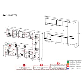 Especificações Técnicas: Dimensões do Produto Montado - Altura: 203cm | Largura: 287cm | Profundidade: 53cm (Balcão) - 32cm (Armários) Espaço para Forno - Altura: 39cm | Largura: 66cm | Profundidade: 49,5cm Material: MDP Acabamento: Acetinado Espessura do Tampo: 15mm Puxadores: ABS Pés: Polipropileno Corrediças: Metálicas Balcão para Cooktop 4 ou 5 Bocas: Sim Nicho para Forno: Sim Balcão Compatível com Pia: Sim