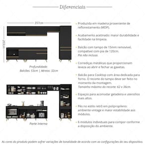 Versatilidade: O balcão com tampo (15mm) recortável é compatível com Cooktop de 4 ou 5 bocas e possui nicho para acomodar o seu forno, otimizando o espaço da cozinha. O recorte do tampo deve ser feito no momento da montagem, conforme o tamanho do seu Cooktop (tamanho máximo do nicho: 62 x 36cm). A cozinha também inclui balcão com tampo removível, compatível com pia de 120cm. Cooktop e pia não inclusos.