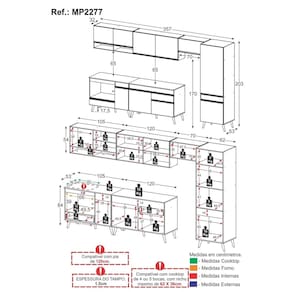 Especificações Técnicas: Dimensões do Produto Montado - Altura: 203cm | Largura: 357cm | Profundidade: 53cm (Balcão) - 32cm (Armário) Espaço para Forno - Altura: 39cm | Largura: 66cm | Profundidade: 49,5cm Espaço para Fogão/Geladeira - Altura: 170cm | Largura: 70cm Material: MDP Acabamento: Acetinado Espessura do Tampo: 15mm Puxadores: ABS Pés: Polipropileno Corrediças: Metálicas Balcão para Cooktop 4 ou 5 Bocas: Sim Nicho para Forno: Sim Balcão Compatível com Pia: Sim