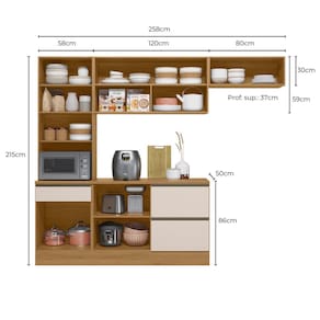 Medida de cada item (A x L x P): Paneleiro Duplo: A.215cm x L.58cm x P.SUP.37cm / P.INF.50cm | Aéreo 2 portas vidro: A.59cm x L.120cm x P.37cm| Aéreo Geladeira: A.30cm x L.80cm x P.37cm | Balcão 120cm com tampo: A.86cm x L.120cm x P.50cm.