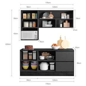 Medida de cada item (A x L x P): Aéreo 1pt: 59cm x 58cm x 37cm; Aéreo nicho micro-ondas: 43cm x 58cm x 45cm; Aéreo 2pt vidro: 59cm x 120cm x 37cm; Balcão 1pt: 86cm x 58cm x 50cm; Balcão 1pt 3gv: 86cm x 120cm x 50cm.