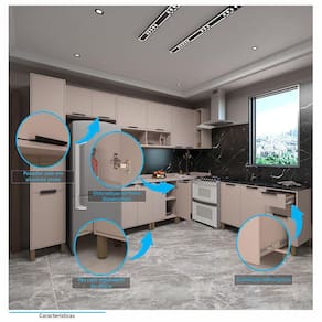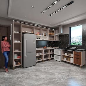 Características Estrutura: 100 MDP Acabamento da Caixaria/Corpo: PF Acabamento das Portas/Frontal: Cinammon PF, demais em BP Quantidade de Portas: 15 Tipo de Abertura das Portas: de Bater/Abrir Tipo de Dobradiças: Metálicas 35mm Slow Motion Quantidade de Gavetas: 3 Tipo de Corrediças: Metálicas Telescópicas Tipo de Puxadores: Aste em Alumínio Preto Quantidade de Prateleiras: 12 Tampo e Rodatampo: 2 Tampos em MDP 25mm e rodatampo de 6cm de altura Sistema de Montagem: Cavilhas, Minifix e Parafusos Garantia do Fabricante: 3 meses