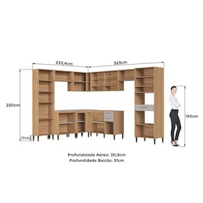 Medida de cada item (A x L x P): JA9301 – Balcão Torre 0,70m – 220x70x50cm JA9211 – Aéreo 0,80m – 33,5x80,8x30,9cm JA9211 – Aéreo 0,80m – 33,5x80,8x30,9cm JA9101 – Balcão 0,80m – 90x81x51cm JA9220 – Aéreo 1,20m – 67x120x30,9cm JA9100 – Balcão pia 1,20m – 90x120x51cm JA9302 – Paneleiro – 217,4x62,8x30,9cm JA9215 – Balcão canto – 67x89,8x62,2 JA9115 – Aéreo canto – 90x90x51