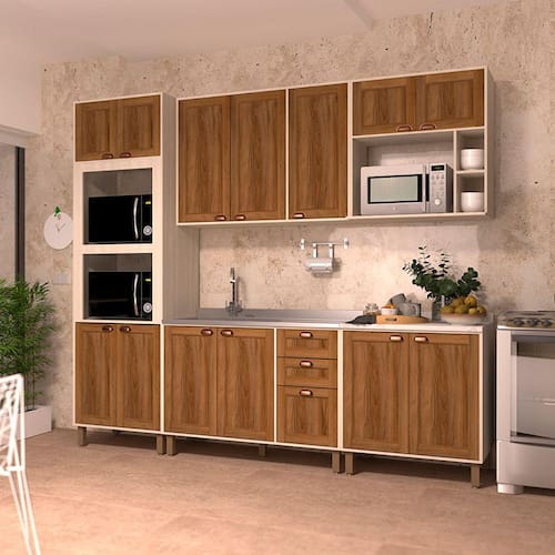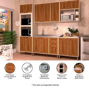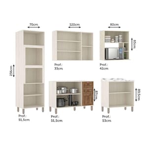 Ambiente composto por: - 1 Balcão de Pia sem Tampo para Cozinha 120cm 2 Portas de Abrir, 3 Gavetas Sofia Luciane Móveis 87 x 120 x 51,5 -Altura x Largura x Profundidade - cm- - 1 Balcão de Cozinha com Tampo 80 cm 2 Portas de Abrir 1 Prateleira Sofia Luciane Móveis 89,5 x 80 x 53 -Altura x Largura x Profundidade - cm- - 1 Armário Aéreo de Cozinha 80cm 2 Portas 4 Prateleiras e Nicho Microondas Sofia Luciane Móveis 85 x 80 x 42 -Altura x Largura x Profundidade - cm- - 1 Armário Aéreo de Cozinha 120 cm 3 Portas 5 Prateleiras Sofia Luciane Móveis 85 x 120 x 33 -Altura x Largura x Profundidade - cm- - 1 Paneleiro de Cozinha 70 cm Nichos para Forno e Microondas 4 Portas Sofia Luciane Móveis 236 x 70 x 51,5 -Altura x Largura x Profundidade - cm-
