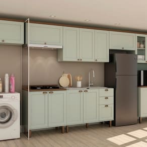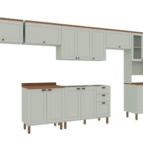 Itens Inclusos: 2 Aéreos de 70 cm, 1 Aéreo de 80 cm, 1 Aéreo de 1,20, 1 Cristaleira Forno, 1 Balcão de 80 cm com tampo e 1 Balcão de 1,20 para pia sem tampo