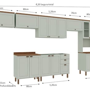 Medida de cada item (A x L x P): Aéreo de 70 cm(46,5x70x31,5) Aéreo de 80 cm(46,5x80x31,5) Aéreo de 70 cm(46,5x70x31,5) Aéreo de 1,20 cm(78x1,20x31,5) Aéreo de 70 cm(46,5x70x31,5) Cristaleira Forno (2,30x80x52,5) Balcão 80 cm( 91x80x51) Balcão de 1,20 (91x1,20x51) Tampo de 80 cm (2,5x80x52,5)