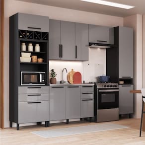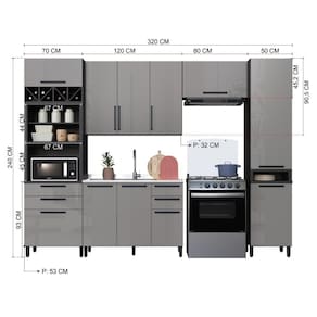Cor: Chumbo/Titânio | MATERIAL: MDP | Tipo de móveis de cozinha: Cozinha Completa | TAMPO DO BALCÃO INCLUSO: NÃO | QUANTIDADE DE GAVETAS: 4 | QUANTIDADE DE PORTAS: 11 | PROFUNDIDADE (CM): 53 | ALTURA (CM): 240 | QUANTIDADE DE PEÇAS: 5 | LARGURA (CM): 320 | Inclui tampo: Não | Materiais do corpo: MDP | Inclui manual de montagem: Sim