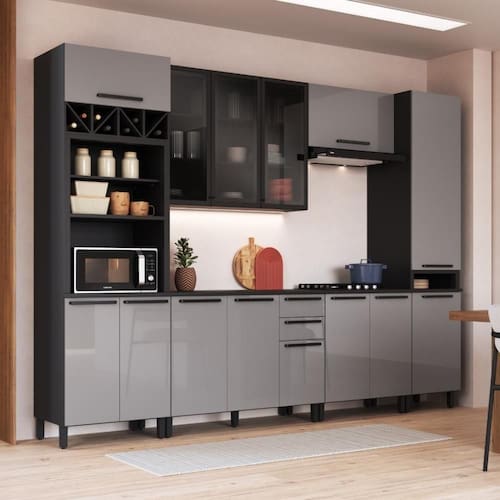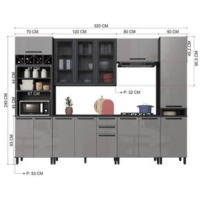 MATERIAL: MDP | Tipo de móveis de cozinha: Cozinha Completa | TAMPO DO BALCÃO INCLUSO: SIM | QUANTIDADE DE GAVETAS: 2 | QUANTIDADE DE PORTAS: 14 | PROFUNDIDADE (CM): 53 | ALTURA (CM): 240 | QUANTIDADE DE PEÇAS: 6 | LARGURA (CM): 320 | Inclui tampo: Sim | Materiais do corpo: MDP | Inclui manual de montagem: Sim | Cor: Chumbo/Titânio