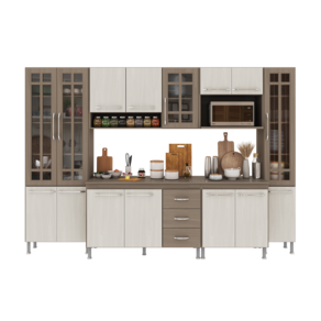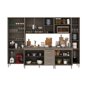 Com módulos avulsos, cada peça é independente, permitindo diferentes composições para melhor aproveitamento do espaço. Seu interior é bem distribuído, com prateleiras e divisórias que auxiliam na organização de utensílios e mantimentos.