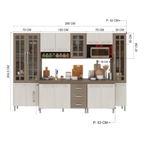 Profundidade: 53cm (balcões) | 32cm (aéreos)
