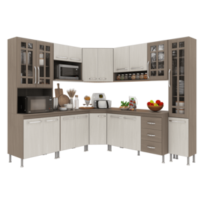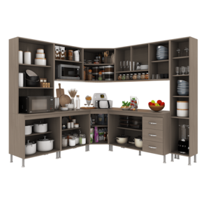 Com módulos avulsos, cada peça é independente, permitindo diferentes composições para melhor aproveitamento do espaço. Seu interior é bem distribuído, com prateleiras e divisórias que auxiliam na organização de utensílios e mantimentos.