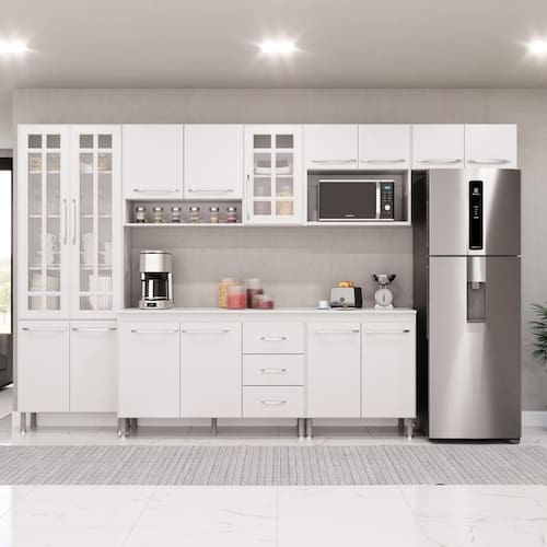 Os módulos são avulsos (cada peça é independente uma da outra) possibilitando assim vários arranjos, o espaço interno, que vem com prateleiras e divisórias, é ótimo para organização dos utensílios e mantimentos. Fabricados em material resistente, como chapas de MDP 15mm, corrediças telescópicas e dobradiças metálicas. Com puxadores cromados em ABS, pés em plástico com regulagem de altura.