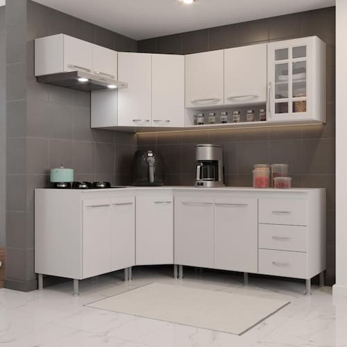 Os módulos são avulsos (cada peça é independente uma da outra) possibilitando assim vários arranjos, o espaço interno, que vem com prateleiras e divisórias, é ótimo para organização dos utensílios e mantimentos. Fabricados em material resistente, como chapas de MDP 15mm, corrediças telescópicas e dobradiças metálicas. Com puxadores cromados em ABS, pés em plástico com regulagem de altura.