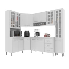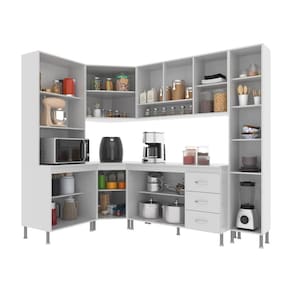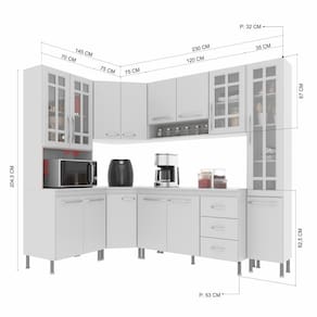 Os módulos são avulsos (cada peça é independente uma da outra) possibilitando assim vários arranjos, o espaço interno, que vem com prateleiras e divisórias, é ótimo para organização dos utensílios e mantimentos. Fabricados em material resistente, como chapas de MDP 15mm, corrediças telescópicas e dobradiças metálicas. Com puxadores cromados em ABS, pés em plástico com regulagem de altura.