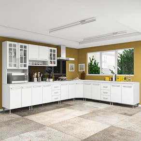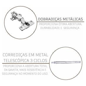 Os módulos são avulsos (cada peça é independente uma da outra) possibilitando assim vários arranjos, o espaço interno, que vem com prateleiras e divisórias, é ótimo para organização dos utensílios e mantimentos. Fabricados em material resistente, como chapas de MDP 15mm, corrediças telescópicas e dobradiças metálicas. Com puxadores cromados em ABS, pés em plástico com regulagem de altura.