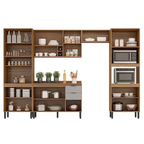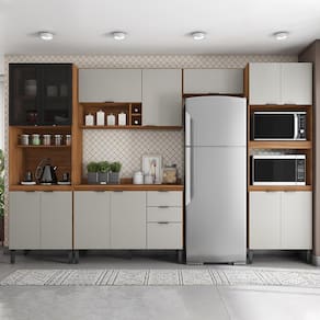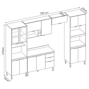 A Cozinha Modulada Firenze Composição 1 é formada por uma torre quente com espaço para dois fornos de até 44L, um aéreo de geladeira 70cm porta basculante com pistão a gás, um aéreo 2 portas 120cm sendo uma com pistão a gás com abertura para cima também com nicho e porta vinhos, um paneleiro 4 portas com 2 portas de vidro fumê, um balcão 120cm com 3 portas e 2 gavetas com tampo MDP que pode ser substituído por pia. Seus pés são de polipropileno reguláveis se adequando as condições do chão, puxadores pretos com design moderno, corrediças telescópicas e dobradiças metálicas. Estruturado em MDP com revestimento ultravioleta e acabamento fosco.