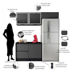 As gavetas contam com corrediças telescópicas, proporcionando abertura total, e as dobradiças reforçadas com sistema slow motion garantem um fechamento suave.