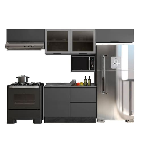 Os módulos possuem pés reguláveis em PVC para nivelamento perfeito e rodapés com presilhas modelo click, que facilitam a remoção. Fabricado em MDP com pintura UV acetinada, o conjunto é durável e de fácil manutenção, além de ser ecologicamente correto.
