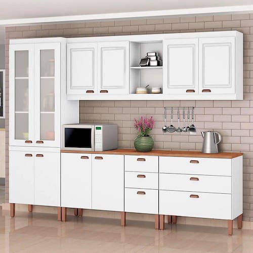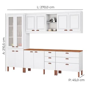 Apresentamos a Cozinha Modulada Completa Juliete da Tuboarte com 2 Balcões em um total de 10 Portas e 6 Gavetas, aliando praticidade, modernidade, resistência a um visual Sofisticado. A Cozinha Juliete é produzida em 100% MDF com revestimento premium em pintura U.V. Touch com 7 camadas de proteção, que confere resistência contra fatores de deterioração e um efeito sofisticado ao acabamento. Marcante também em termos de estética, este belíssimo móvel possui no total 5 Módulos (Paneleiro com 4 portas sendo 2 Portas em Vidro texturizado, Armário Aéreo Triplo c/ Nicho, Armário Aéreo Duplo e 2 balcões Independentes com 2 Portas e 6 gavetas, todas com abertura Telescópica) os puxadores tem designe Vintage e acabamento em estilo Cobre! Assim, os Pés são em ABS de alta resistência com nivelamento de altura! Gostou?! Clica em “Comprar” e transforme sua cozinha!Características:Material Principal: 100% MDFPintura touch com 7 Camadas de ProteçãoPuxadores vintage cor BronzeDesign inovadorPortas usinadas em Baixo RelevoCorrediças TelescópicasPés ReguláveisPortas com vidro TexturizadoExcelente divisão internaDimensões do produto:Altura: 210,5 cmLargura: 270 cm Profundidade: 47,1 cmPeso: 145 KgGarantia do Fornecedor 3 meses.