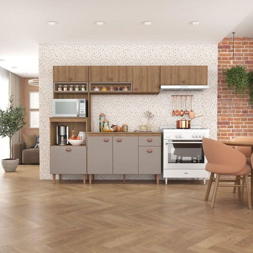A cozinha modulada Marti é a escolha perfeita para seu lar! Composta por 5 módulos separados que podem ser montados conforme sua necessidade. Produzida em MDP 12mm com frentes 15mm com material de extrema qualidade. Acompanha: Torre Quente para 2 fornos, Balcão de Pia com Tampo , Aéreo de pia e Aéreo de 80cm que pode ser utilizado sob geladeira ou fogão. Medidas em cm (A x L x P): Balcão de pia: 85x120x52; Aéreo: 45x120x27; Kit fornos: 198x61x52; Aéreo:27x80x27cm. O balcão de pia possui 1 gaveta com corrediça telescopia e prateleira interna. O aéreo possui porta basculante com pistão e nicho com moldura. A torre acompanha dois nichos para forno e micro nas medidas: 37x64x52cm além de porta basculante e nicho com moldura. Pés e puxadores na cor Bronze. Compre agora essa linda e moderna cozinha! Acabamento da Prateleira: Cristal Escala de Brilho da Prateleira: Semi-Brilho Acabamento da Gaveta: Finish Foil Escala de Brilho da Gaveta: Semi-Brilho Material do Puxador da Gaveta: PVC Acabamento da Porta: Finish Foil Escala de Brilho da Porta: Semi-Brilho Material do Puxador da Porta: PVC Acompanha Tampo: Sim Altura dos Pés: 17 cm Altura Máxima dos Pés: 17.0000 Ambiente Principal: Cozinha codigo_ean: 7909903553695 Complexidade da Montagem: Baixa: pode ser montado por uma pessoa sozinha Cor: Mel/Cinza Cor do Produto: Mel/Cinza Cor Interna: MEL Escala de Brilho: Semi-Brilho Espessura do Material da Estrutura: 12 mm Espessura do Tampo: 12 mm Gaveta com Chave: Não Itens Inclusos: Móvel, manual de montagem, acessórios Linha ou Coleção: Marti Manual de Montagem e Instalação: https://product-hub-prd.madeiramadeira.com.br/883522/documents/908d20ce-53e2-4a32-a543-5085d23ef1091702415mt03ct.pdf Material da Dobradiça/Corrediça da Porta: Metálica Material da Gaveta: MDP Material da Porta: MDP Material da Prateleira: MDP Material do Fundo: MDP Material do Tampo: MDP Material dos Pés: PVC Medida de cada item (A x L x P): Aéreo 1804-ML 27x80x27cm; Balcão de pia 1800-ML/FE 47x120x52cm, Aéreo 1801-ML/FE 45x120x27cm, Kit duplo para fornos 1802-ML/FE 198x61x52cm, Tampo 1,2x120x52 modular: Sim Necessita Montagem: Sim O Balcão Acompanha Pia: Não Origem do Produto: Nacional Pés Reguláveis: Sim Peso: 86,2 kg Peso Máximo por Gaveta: 2 kg Peso Máximo por Prateleira: 5 kg Possui Pés: 09 Possui Portas: Sim Possui Prateleiras: Sim Possui recorte para Cooktop: Não Possui Rodízio: Não Possui Vidro: Não Produto Montado: Sim Recomendações de Uso, Manutenção e Limpeza: Pano levemente umedecido com água Sapatas Niveladoras: Não Sistema de Montagem: Parafusos Tamanho Indicado da Pia: 120 x 52 Tipo de Corrediça da Gaveta: Metálica Telescópica Tipo de Dobradiça da Porta: Simples Tipo de Puxador da Gaveta: Externo Tipo de Puxador da Porta: Externo