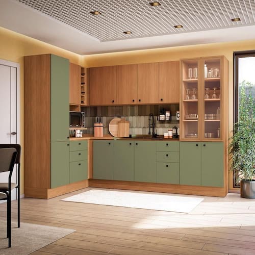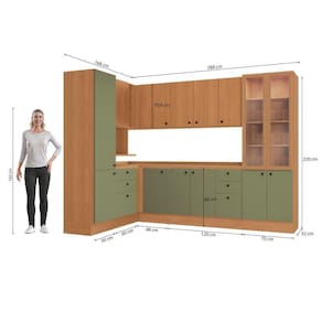 São nove peças, incluindo cristaleira, paneleiro, balcão e aéreo de canto, nicho microondas, gaveteiro, balcões e aéreos, ele se adapta a espaços amplos, garantindo estilo e muito espaço para organizar louças, mantimentos e demais itens. Com 2,20m de altura, ele conta com uma combinação de cores linda. O corpo e os aéreos trazem o aconchego da cor canela, em pintura touch com a textura dos veios da madeira, enquanto as frentes, em acabamento BP fosco, contam com a modernidade do verde frevo e maior resistência contra riscos, arranhões e gotas d'água.