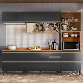 Cozinha Modulada Proença 5 Peças Com Aéreo 80cm Nogueira Touch/carbono Prime Tx - Demartêz Cozinha Modulada Proença 5 Peças com Aéreo 80cm - Demartêz A Cozinha Modulada Proença 5 Peças com Aéreo 80cm une sofisticação e praticidade. Fabricada em MDF com pintura UV, conta com portas, sendo 3 com vidro reflecta, dobradiças com amortecimento e pistão a gás. Possui gavetas com corrediças telescópicas para abertura suave, puxadores metálicos e espaço planejado para cooktop, depurador e forno ou micro-ondas (64 x 45 x 51 cm). O balcão de 120cm acompanha divisor de talheres, e os tampos em MDF estão presentes nos balcões de 120cm e 80cm. Com pés reguláveis e amplo espaço interno, é ideal para uma cozinha organizada e elegante. ESPECIFICAÇÕES: - Estrutura em MDF - Pintura UV - Portas sendo 3 com vidro reflecta - Dobradiças com amortecimento - Pistão a gás - Gavetas - Corrediças telescópicas - Puxadores metálicos - Espaço para cooktop e depurador - Espaço para forno ou micro-ondas (L x A x P): 64 x 45 x 51 cm - Acompanha divisor de talheres no balcão 120cm - Tampo em MDF no balcão 120cm e 80cm - Pés com regulagem de altura - Amplo espaço interno