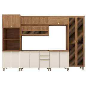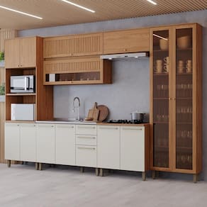A Cozinha Modulada Requinte 6 Peças com Torre Quente 2 Fornos da Móveis Henn é a escolha ideal para quem busca funcionalidade com um toque de sofisticação. Com estrutura em MDF e MDP e pintura UV texturizada, ela garante durabilidade e acabamento de alto padrão. As portas contam com dobradiças metálicas com amortecimento e puxadores dourados que valorizam ainda mais o design do conjunto. A torre quente oferece espaço ideal para acomodar dois fornos, enquanto as gavetas com corrediças telescópicas do balcão de 120cm podem ser montadas à direita ou à esquerda, conforme a sua necessidade. A cozinha conta ainda com vidro reflecta na cor champanhe nas portas da cristaleira, chapéu com detalhe soft e divisor de talheres no balcão 120cm. O tampo do balcão 80cm é próprio para instalação de cooktop. Com pés em ABS com regulagem de altura e amplo espaço interno, esta composição garante organização, beleza e praticidade para o seu dia a dia.