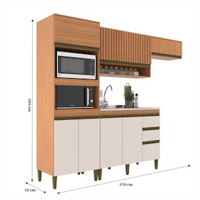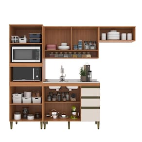 Caracteristicas: 3 Gavetas com corredicas telescopicas 2 Nichos para forno ou micro-ondas 7 Portas com dobradicas metalicas 2 Prateleiras internas Altura dos pes 17cm Espessura Chapa 15mm Estrutura em MDP Perfect Nao acompanha pia Pes em polipropileno Puxador perfil Sistema de montagem parafusos philips