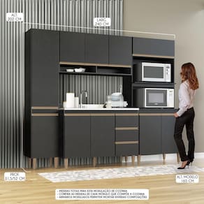 Cozinha Modulada Sabrina Balcão Pia Torre Quente Menu Móveis Preto A Cozinha Modulada Sabrina foi desenvolvida para atender todas as suas necessidades do dia a dia com um design moderno, cheio de atitude, personalidade, funcionalidade, beleza e versatilidade. A Cozinha preta e a tendencia do momento e foi arquitetada com modulos uteis que vao facilitar a sua rotina diaria nos preparos dos alimentos e armazenamento dos utensilios e mantimentos, mantendo sua cozinha sempre organizada.