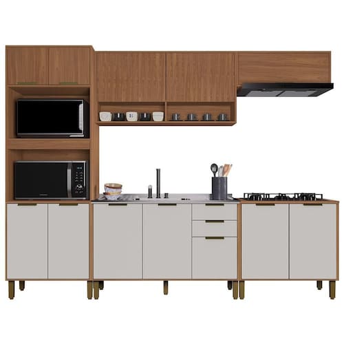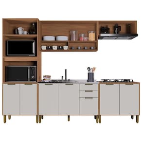 Cozinha Modulada Toronto 5 Peças com Balcão 120cm sem Tampo - Indékes Funcional e elegante, a Cozinha Toronto é ideal para quem busca praticidade no dia a dia. Com estrutura em MDP e pintura UV, conta com portas com dobradiças metálicas, gavetas com corrediças telescópicas, puxadores embutidos em ABS e prateleiras internas bem distribuídas. O espaço para eletrodomésticos traz mais versatilidade ao ambiente. O balcão de 80cm acompanha tampo em MDP de 15mm, enquanto o balcão de 120cm é fornecido sem tampo, permitindo personalização. Todos os módulos possuem pés em plástico com regulagem de altura para melhor nivelamento.