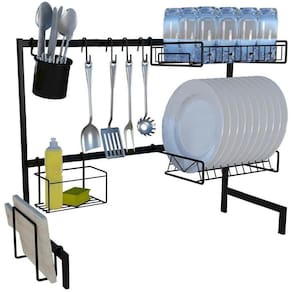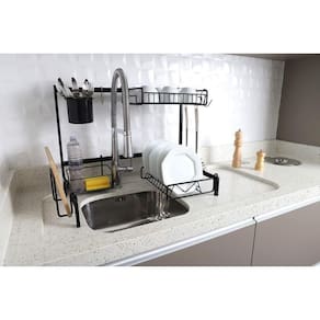 Características: Fabricado 100% em aço. Ideal para facilitar sua organização na bancada da cozinha. Auto-sustentação, com auxílio de pés para pôr na bancada da pia. Extensor de altura, para ajustar de 46cm à 55cm. Suporta até 20kg.